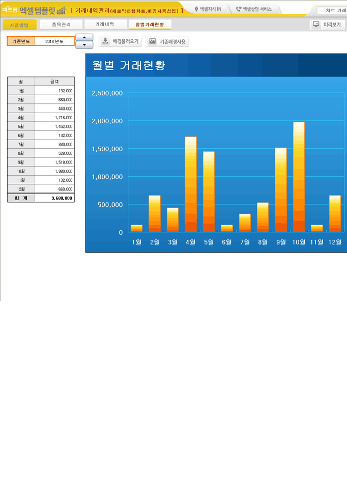 9,000원/월거래내역을 입력하면 버튼을 통하여 단가 및 공급가액을 자동으로 계산할 수 있으며, 회전자 버튼 클릭하면 해당년도에 대한 월별 공급가액 합계 및 차트를 나타낼 수 있는 엑셀자동차트입니다.