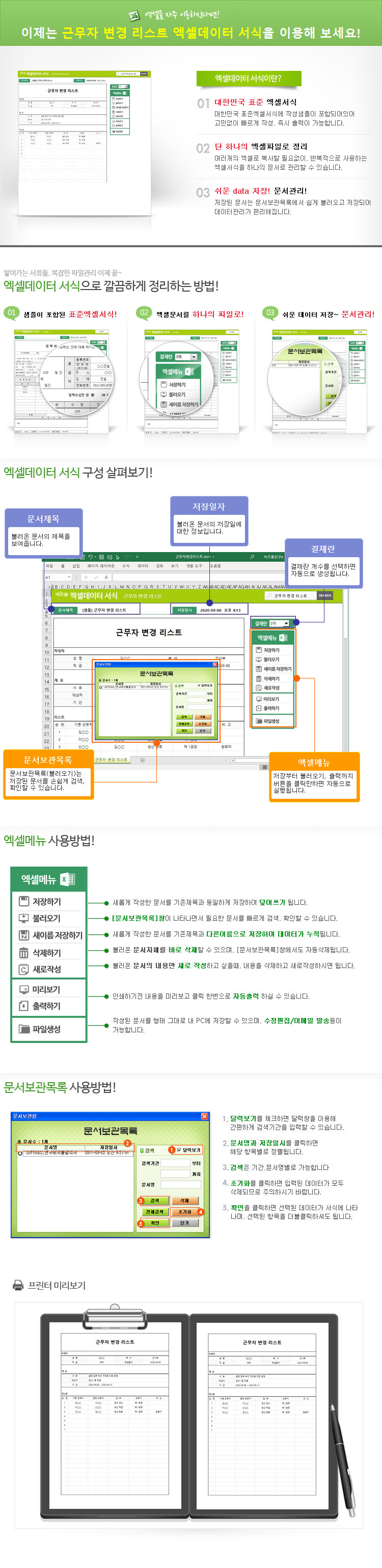 근무자변경리스트입니다. 성명, 부서, 직급, 작성일자, 사유, 대상자, 기간, 순번, 기존 근무자, 변경 근무자, 업무, 근무지, 비고 등으로 구성되어 있습니다. 작성 건별로 데이터 누적, 저장, 수정, 불러오기, 별도 파일로 저장이 가능한 엑셀 데이터 서식입니다.
