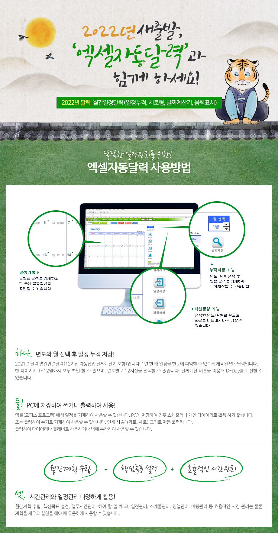 2021년 달력_월별자동달력(음력표시,일정누적,날짜계산기능)입니다. 월별로 표시하는 달력으로 아래의 빈공간에 일정을 작성할 수 있으며 D-day 및 기념일 계산기도 포함되어 있습니다. 년, 월 단위로 누적관리를 할 수 있고 필요한 부분에 대하여 프린터를 사용하여 출력할 수 있습니다.