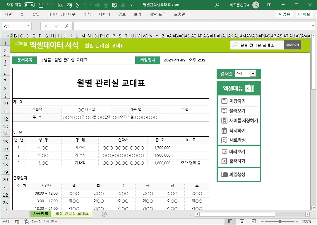 월별관리실교대표입니다. 건물명, 기준 월, 주소, 순번, 성명, 형태, 연락처, 급여, 비고, 주차, 시간대, 월, 화, 수, 목, 금, 토 등으로 구성되어 있습니다. 작성 건별로 데이터 누적, 저장, 수정, 불러오기, 별도 파일로 저장이 가능한 엑셀 데이터 서식입니다.