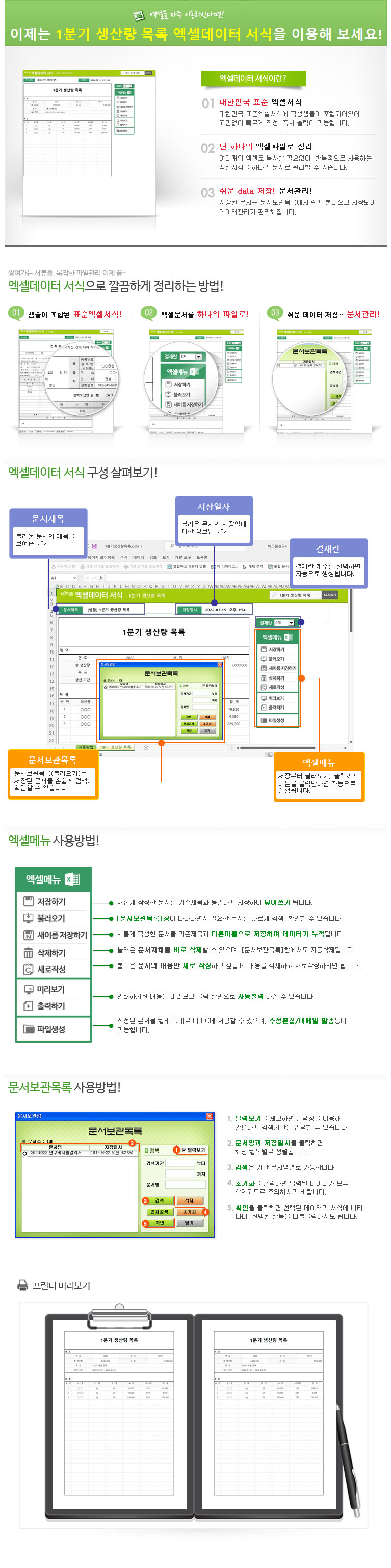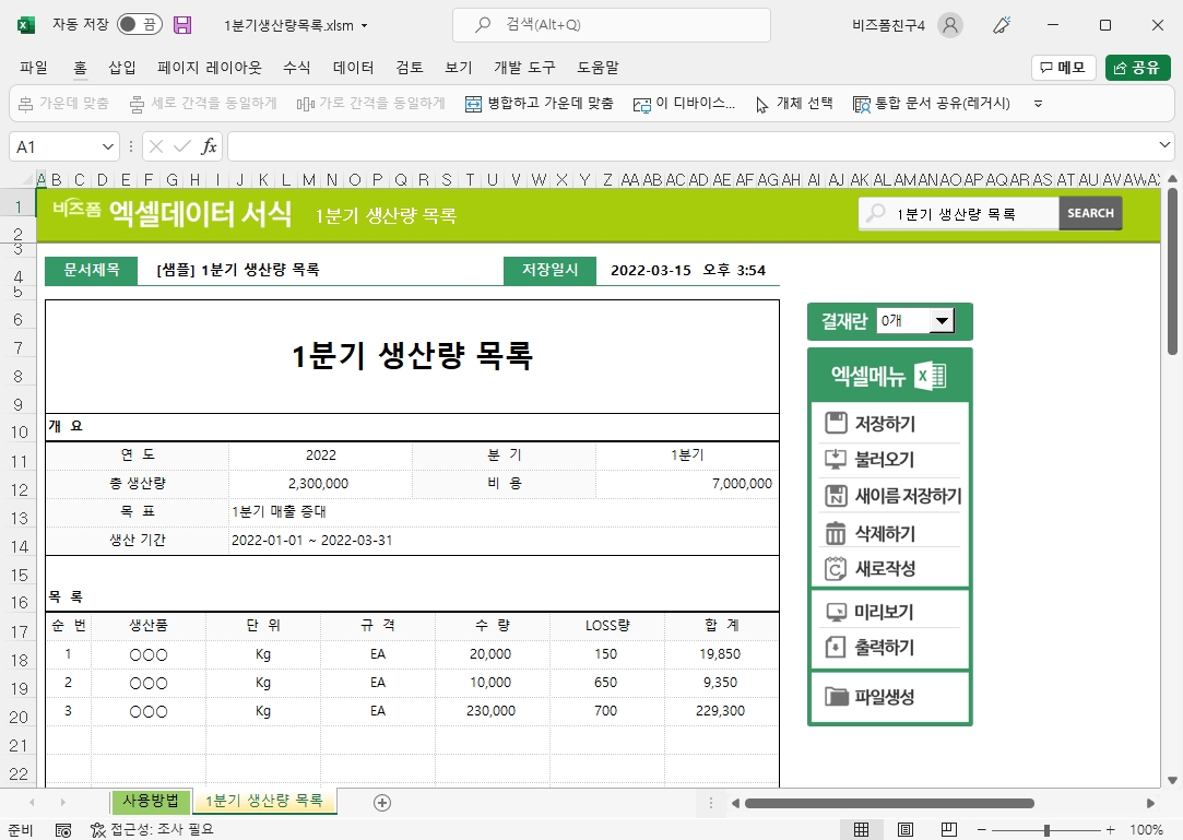 1분기생산량목록입니다. 연도, 분기, 총 생산량, 비용, 목표, 생산 기간, 순번, 생산품, 단위, 규격, 수량, LOSS량, 합계 등으로 구성되어 있습니다. 작성 건별로 데이터 누적, 저장, 수정, 불러오기, 별도 파일로 저장이 가능한 엑셀 데이터 서식입니다.