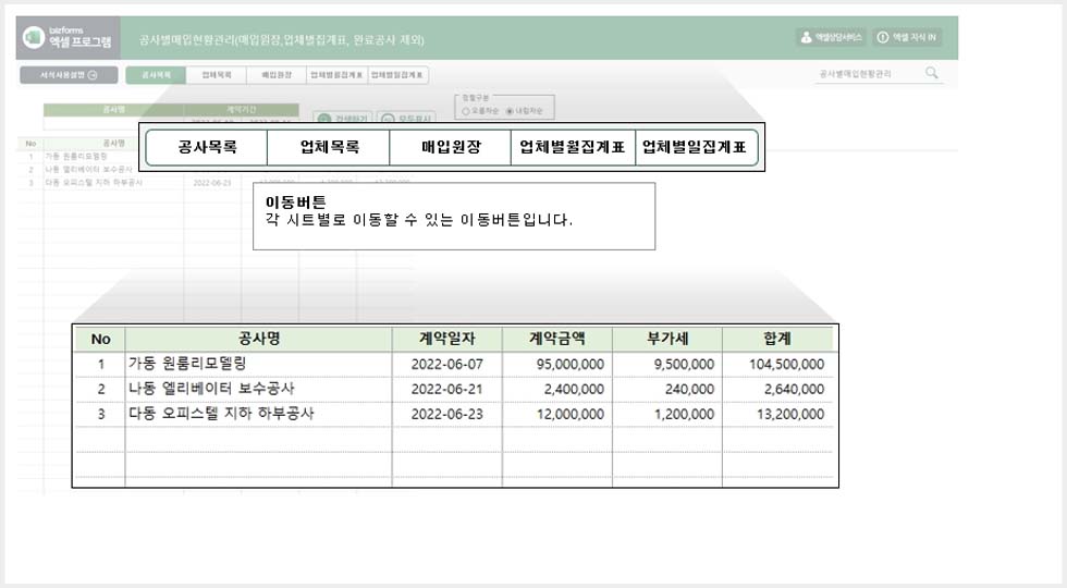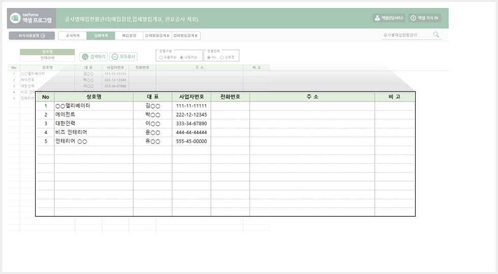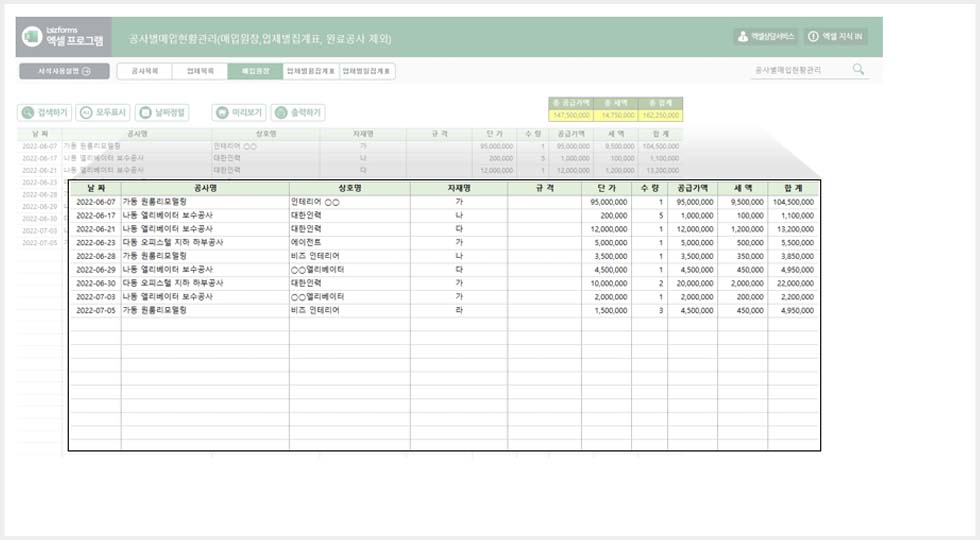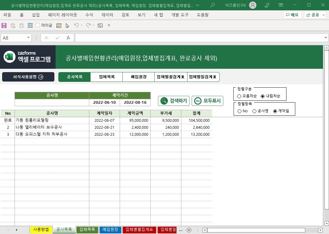 공사별매입현황관리(매입원장,집계표 완료공사 제외)(공사목록, 업체목록, 매입원장, 업체별월집계표, 업체별일집계표)입니다. 공사별 매입현황을 관리할 수 있는 프로그램입니다. ※ 프로그램 규격 : MS오피스 엑셀 2013 이상※ 프로그램 구성 : 사용방법, 공사목록, 업체목록, 매입원장, 업체별월집계표, 업체별일집계표