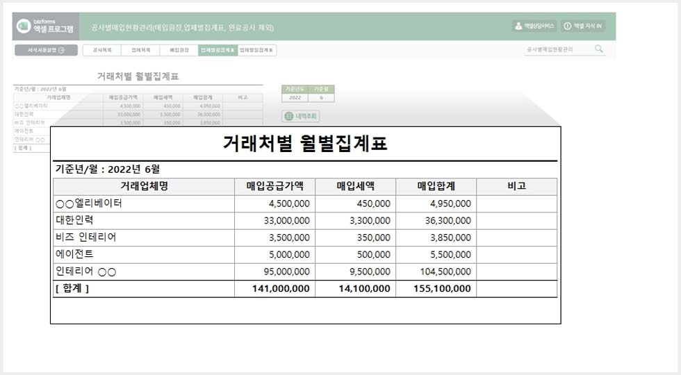 미리보기 : 업체별 월별집계표를 인쇄 전 미리 볼 수 있습니다.