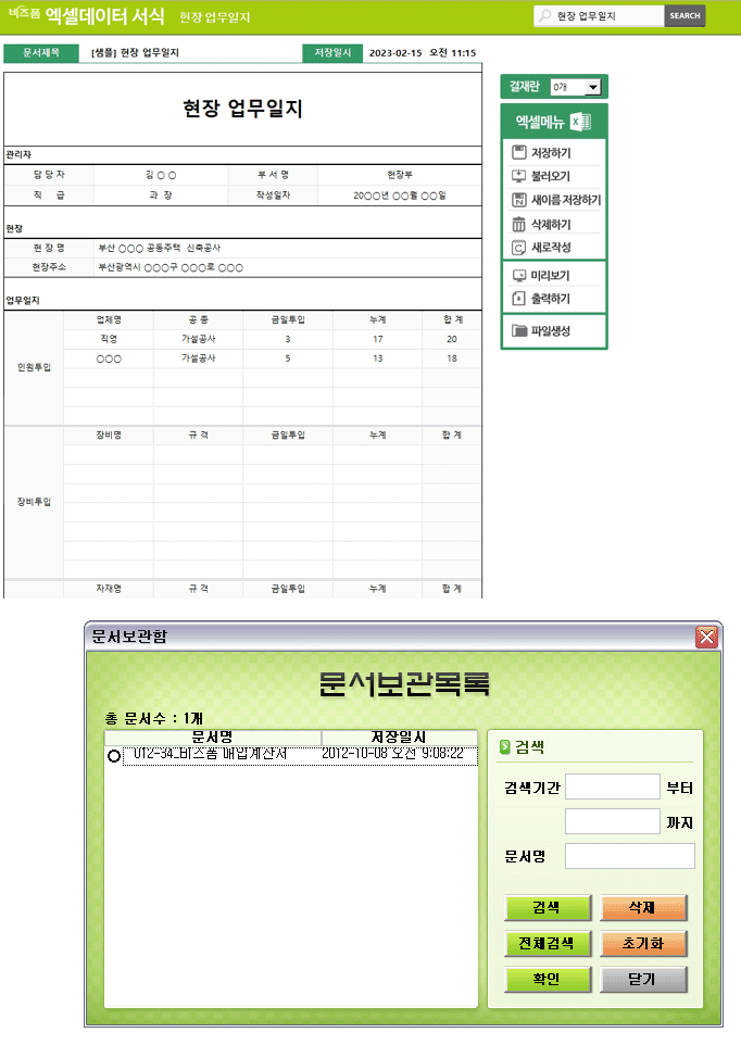 현장 업무일지 입니다. 관리자, 현장명, 현장주소, 인원투입, 장비투입, 자재투입 등으로 구성되어 있습니다. 작성 건별로 데이터 누적, 저장, 수정, 불러오기, 별도 파일로 저장이 가능한 엑셀 데이터 서식입니다.