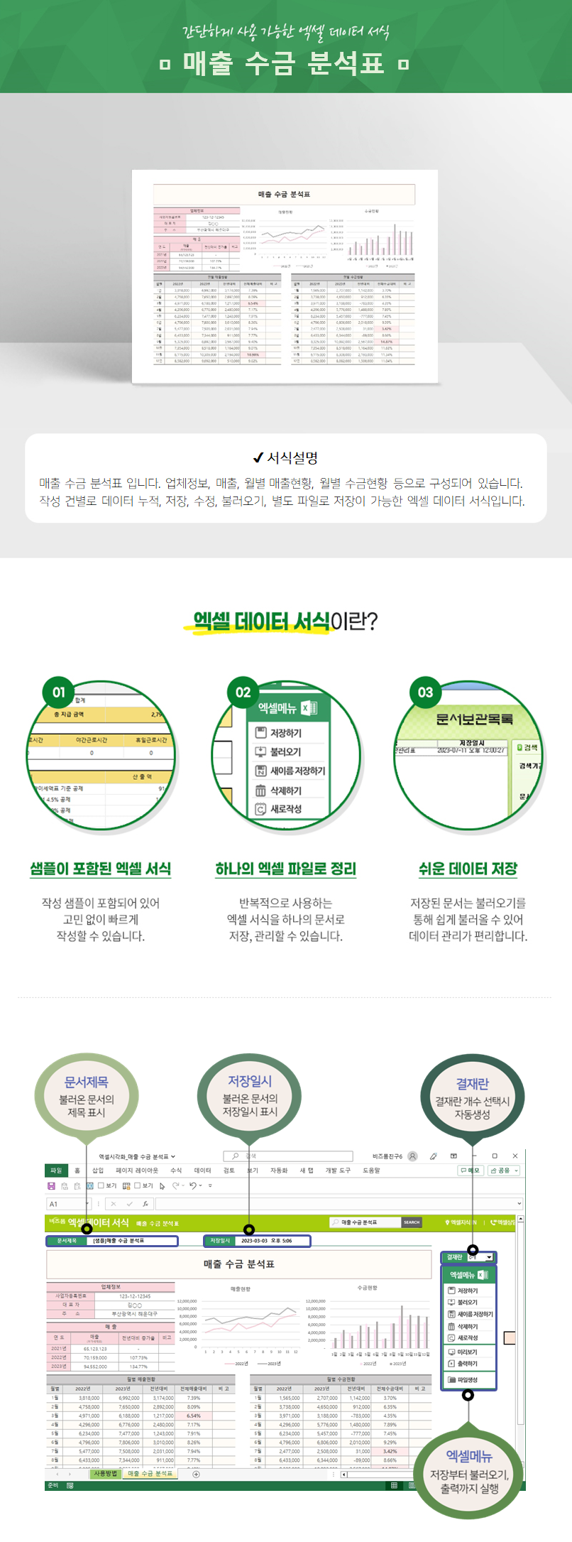 매출 수금 분석표 입니다. 업체정보, 매출, 월별 매출현황, 월별 수금현황 등으로 구성되어 있습니다. 작성 건별로 데이터 누적, 저장, 수정, 불러오기, 별도 파일로 저장이 가능한 엑셀 데이터 서식입니다.