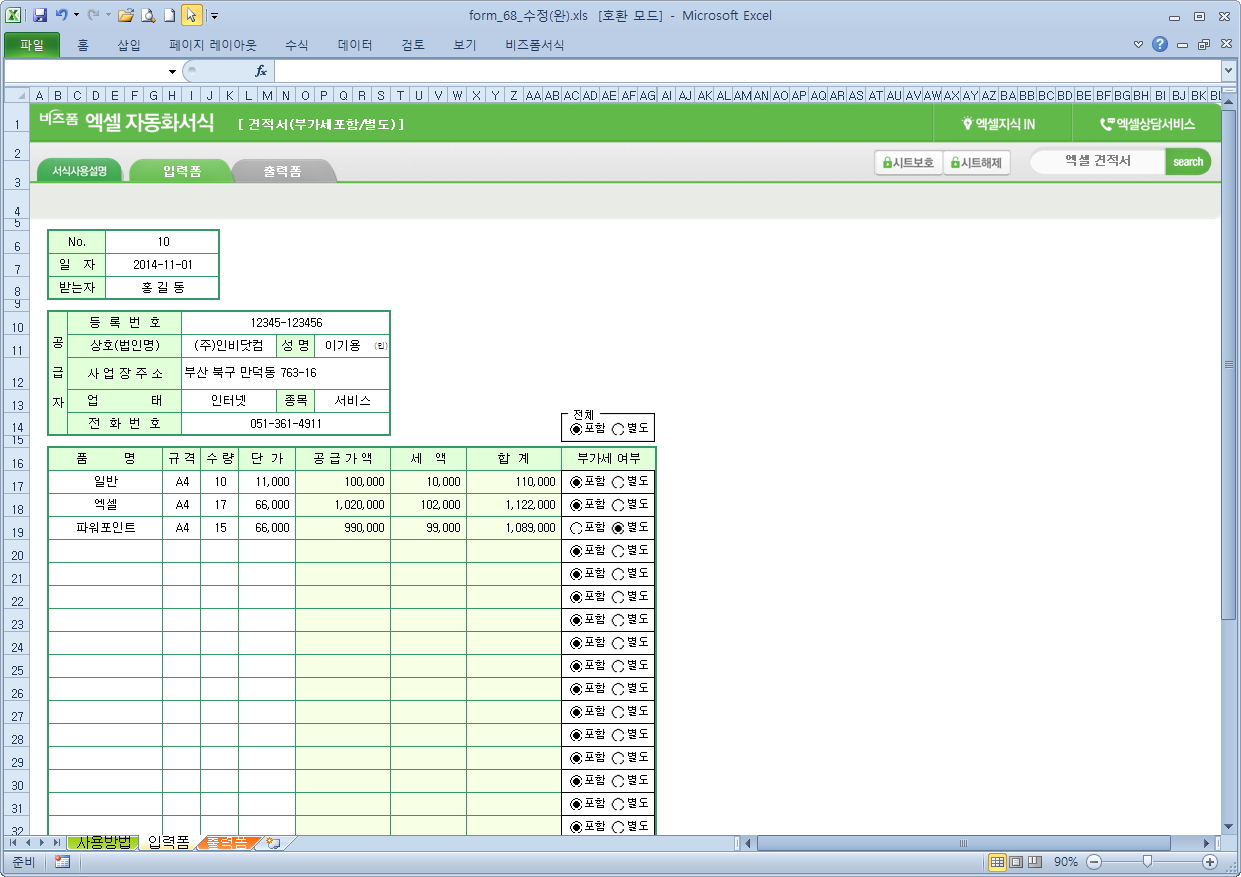 9,000원/월견적서의 기존정보를 입력하면 견적서 양식으로 자동이동 되어 출력폼에서 출력할 수 있는 자동화서식입니다. 단가와 수량을 입력하면 자동으로 금액과 합계 금액이 계산되는 서식입니다. 부가세를 포함하거나 별도로 할 수 있는 수식이 들어있는 서식입니다.