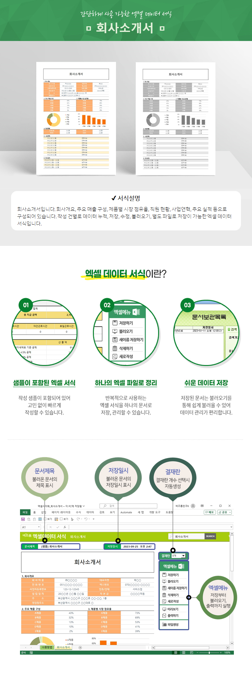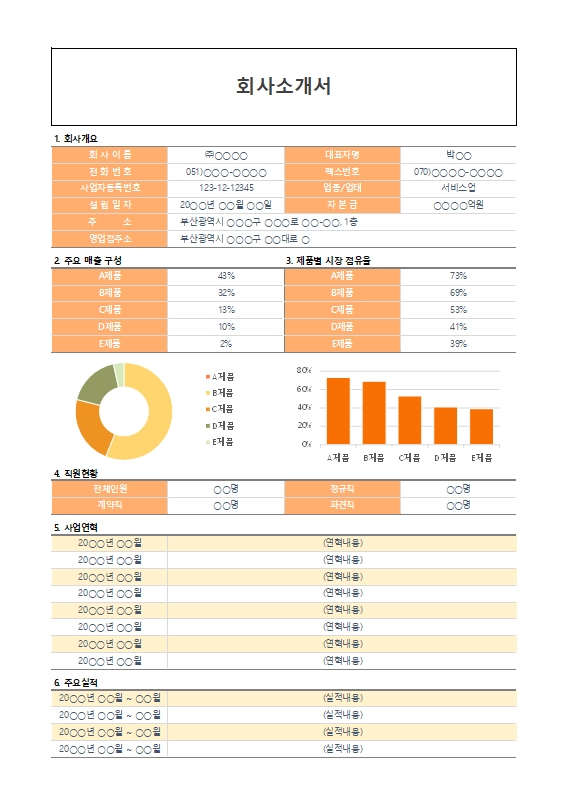 회사소개서입니다. 회사개요, 주요 매출 구성, 제품별 시장 점유율, 직원 현황, 사업연혁, 주요 실적 등으로 구성되어 있습니다. 작성 건별로 데이터 누적, 저장, 수정, 불러오기, 별도 파일로 저장이 가능한 엑셀 데이터 서식입니다.