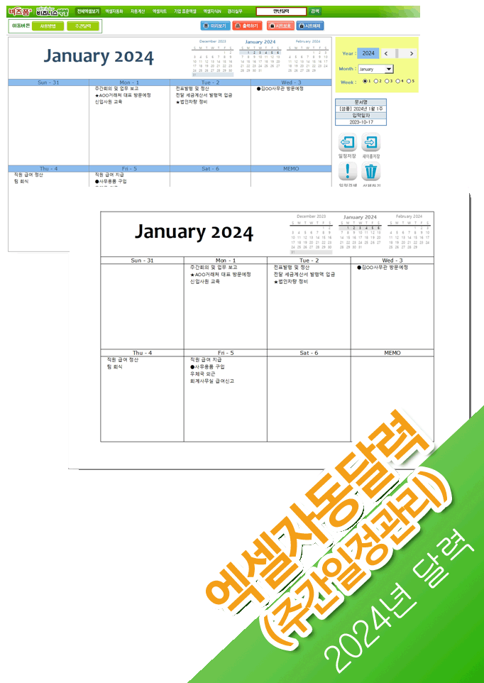 2024년 주간스케줄달력(주간일정저장)입니다. 2024년 달력을 주단위로 업무 및 스케줄을 작성할 수 있습니다. 일정 및 스케줄은 주 단위로 저장, 검색, 삭제를 할 수 있으며 원하는 주 단위로 출력할 수 있습니다.