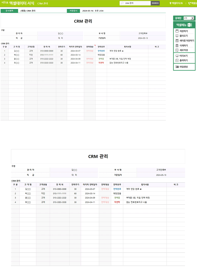 CRM 관리 서식입니다. 구분(관리자, 부서명, 직급, 기준일자), CRM 관리(구분, 고객명, 고객유형, 연락처, 연락 주기, 마지막 연락일자, 연락대상, 연락유무, 특이사항, 비고) 등으로 구성되어 있습니다. 작성 건별로 데이터 누적, 저장, 수정, 불러오기, 별도 파일로 저장이 가능한 엑셀 데이터 서식입니다.
