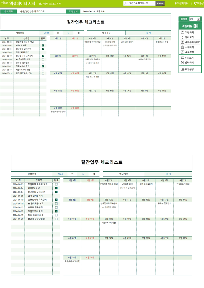 월별 업무를 정리하여 체계적인 관리가 가능하며, 완료 상태를 명확히 파악하여 놓치는 업무를 방지할 수 있습니다.