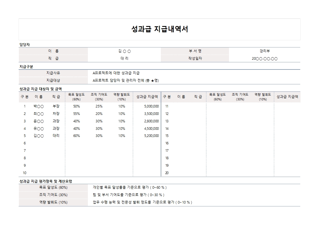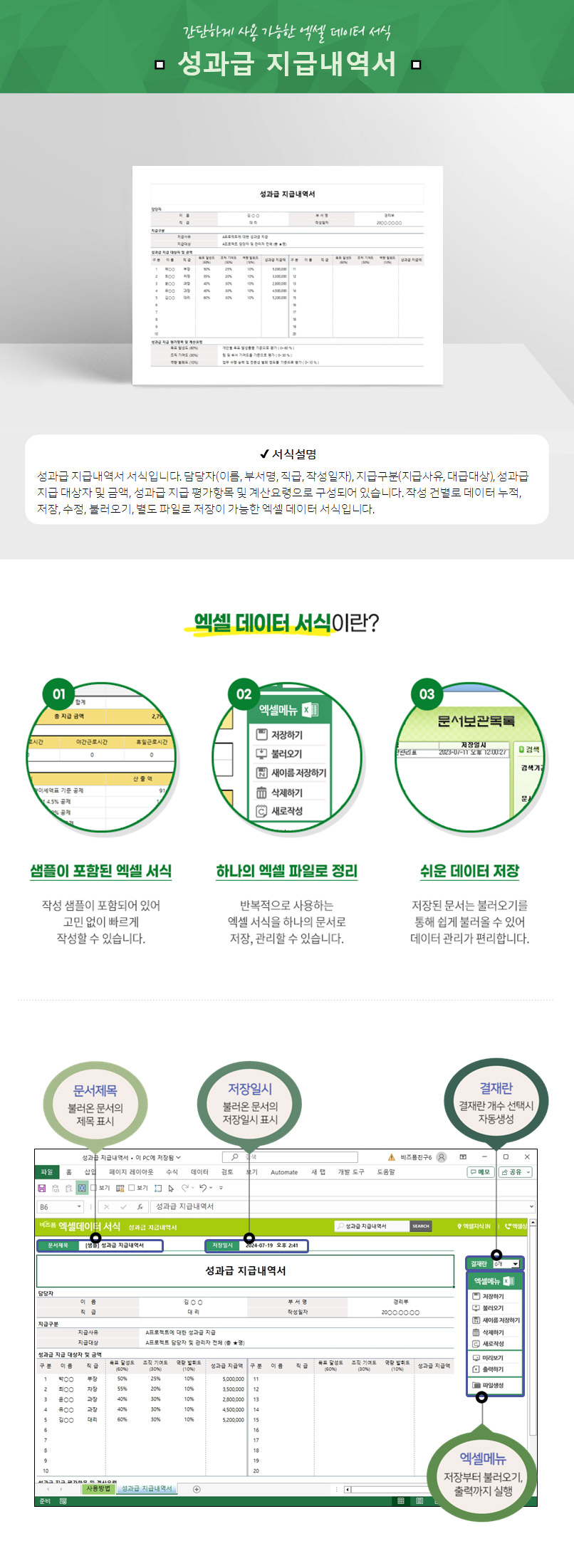 성과급 지급내역서 서식입니다. 담당자(이름, 부서명, 직급, 작성일자), 지급구분(지급사유, 대급대상), 성과급 지급 대상자 및 금액, 성과급 지급 평가항목 및 계산요령으로 구성되어 있습니다. 작성 건별로 데이터 누적, 저장, 수정, 불러오기, 별도 파일로 저장이 가능한 엑셀 데이터 서식입니다.