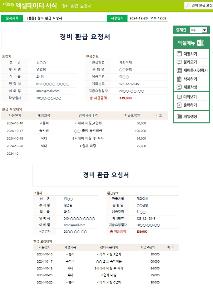 경비 환급 요청서 서식입니다. 경비 환급 요청서 서식은 일반적으로 회사나 기관에서 경비를 지출한 직원이 그 금액을 환급받기 위해 작성 후 제출하는 문서입니다. 작성 건별로 데이터 누적, 저장, 수정, 불러오기, 별도 파일로 저장이 가능한 엑셀 데이터 서식입니다.