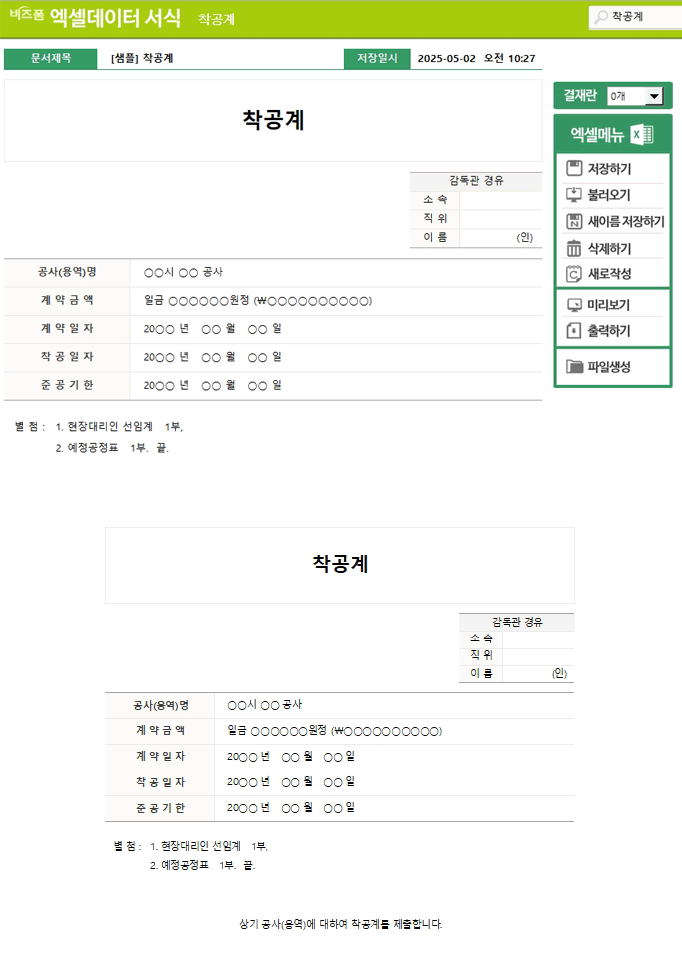 착공계 서식입니다. 착공계는 계약에 따라 발주된 공사나 작업에 실제로 착수함을 발주처에 알리기 위해 제출하는 공식 서류입니다. 작성 건별로 데이터 누적, 저장, 수정, 불러오기, 별도 파일로 저장이 가능한 엑셀 데이터 서식입니다.