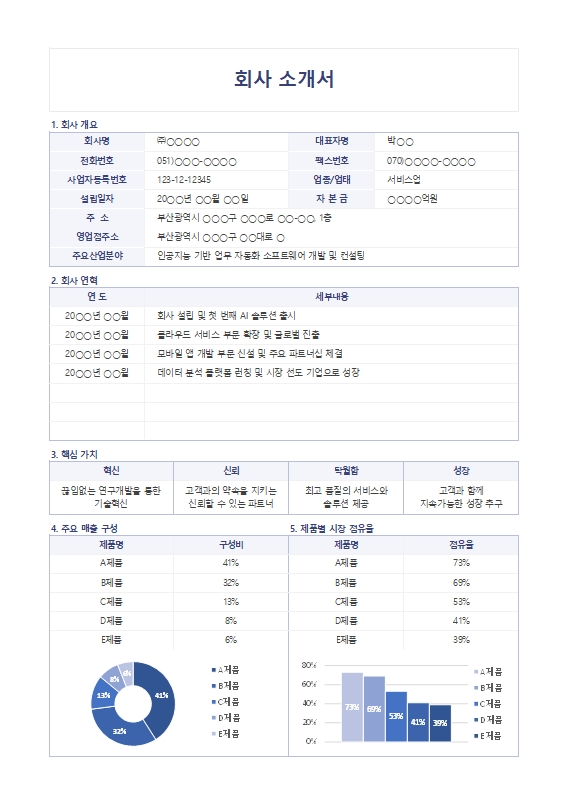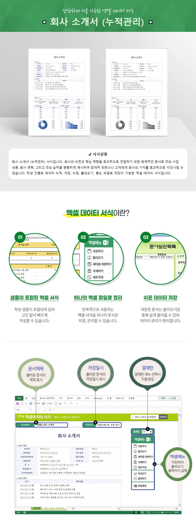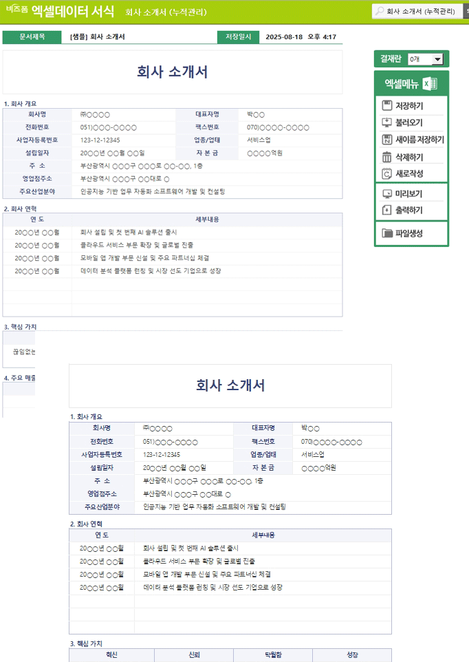 회사 소개서 (누적관리) 서식입니다. 회사의 비전과 핵심 역량을 효과적으로 전달하기 위한 체계적인 문서로 주요 사업 내용, 회사 연혁, 그리고 주요 실적을 명확하게 제시하여 잠재적 파트너나 고객에게 회사의 가치를 효과적으로 각인시킬 수 있습니다. 작성 건별로 데이터 누적, 저장, 수정, 불러오기, 별도 파일로 저장이 가능한 엑셀 데이터 서식입니다.