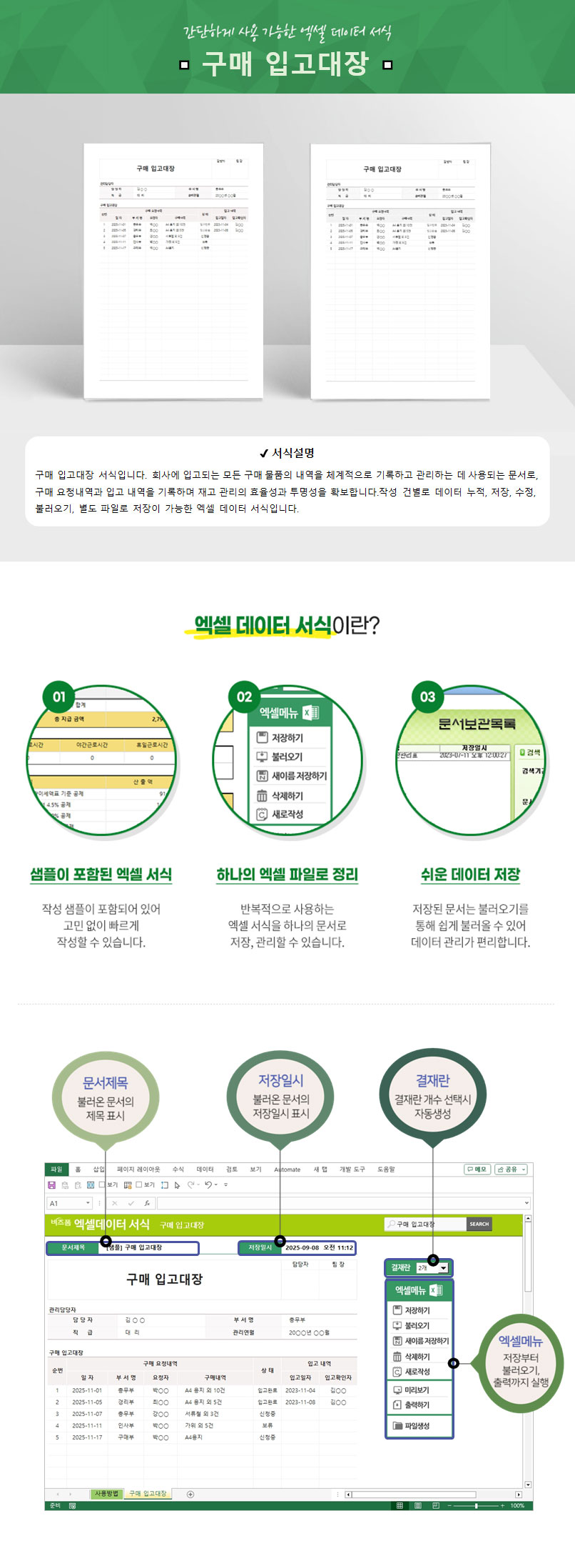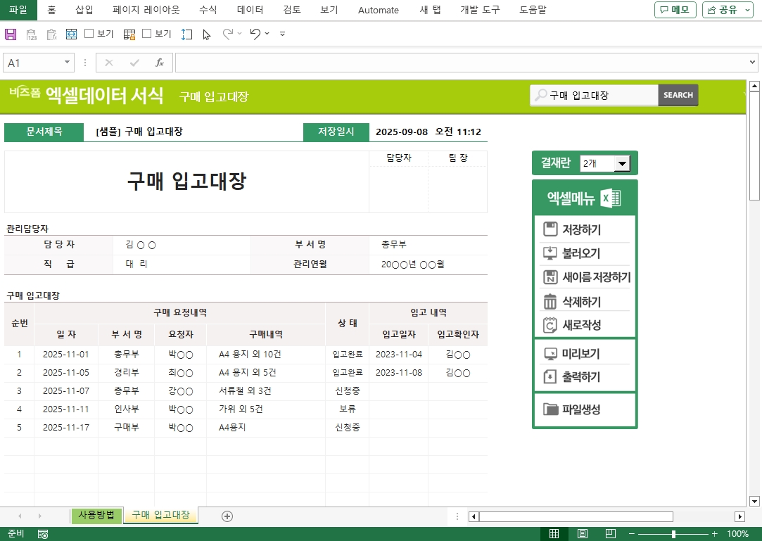 구매 입고대장 서식입니다. 회사에 입고되는 모든 구매 물품의 내역을 체계적으로 기록하고 관리하는 데 사용되는 문서로, 구매 요청내역과 입고 내역을 기록하며 재고 관리의 효율성과 투명성을 확보합니다. 작성 건별로 데이터 누적, 저장, 수정, 불러오기, 별도 파일로 저장이 가능한 엑셀 데이터 서식입니다.