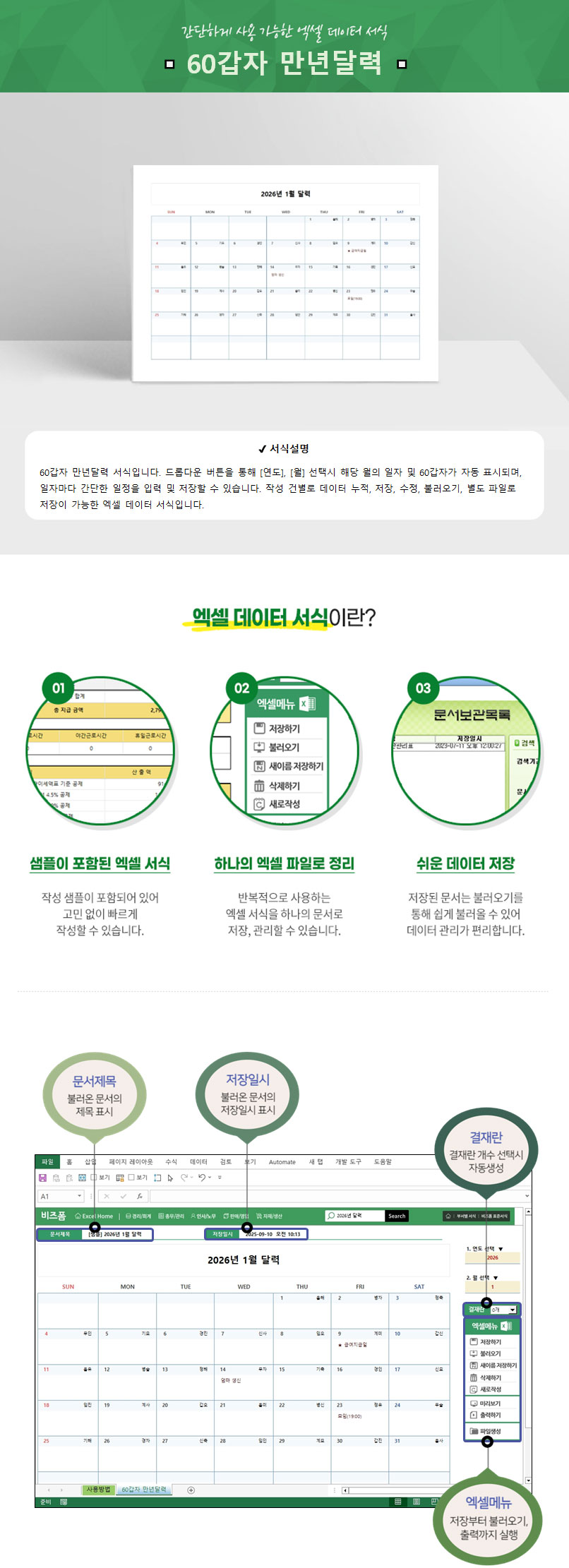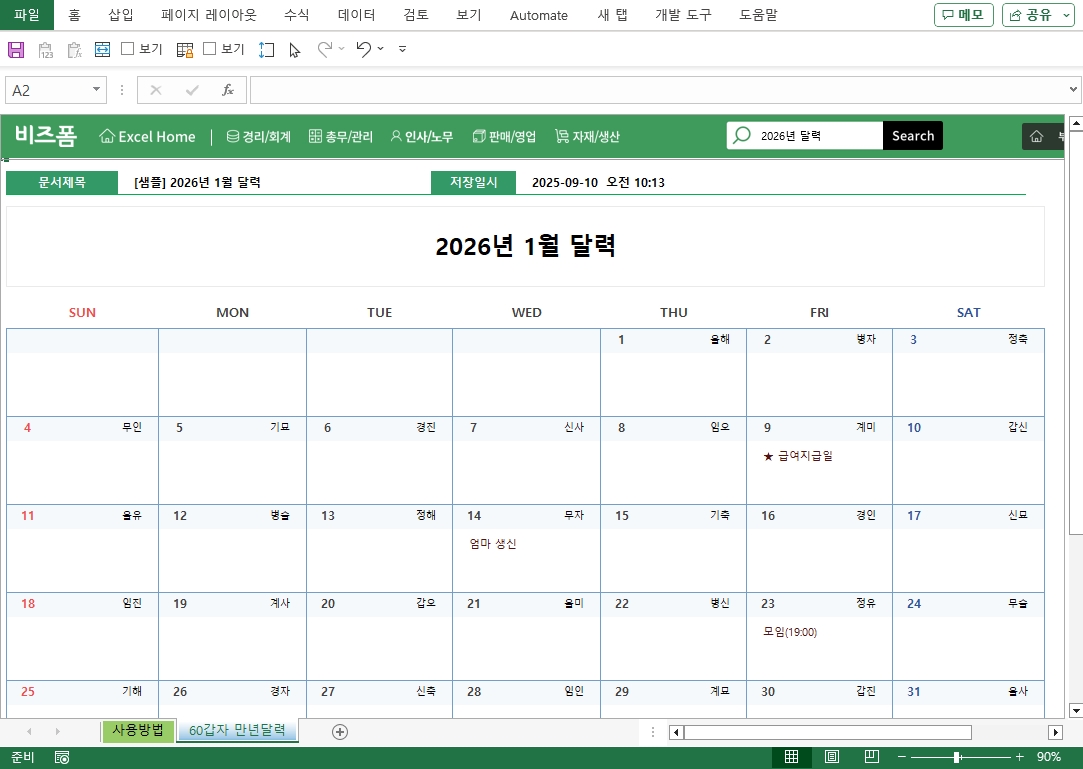 2026년 60갑자 만년달력입니다. 일자별 60갑자가 적혀져 있는 서식으로 월 변경 시 달력이 자동으로 생성되며, 본 서식을 통해 업무 및 개인 일정을 효과적으로 기록하고 안정적으로 저장하여 관리 효율을 극대화할 수 있습니다. 이는 연간 계획 수립 및 체계적인 일정 관리를 위한 필수적인 도구가 될 수 있습니다.