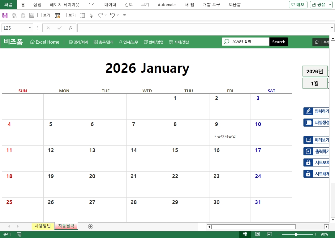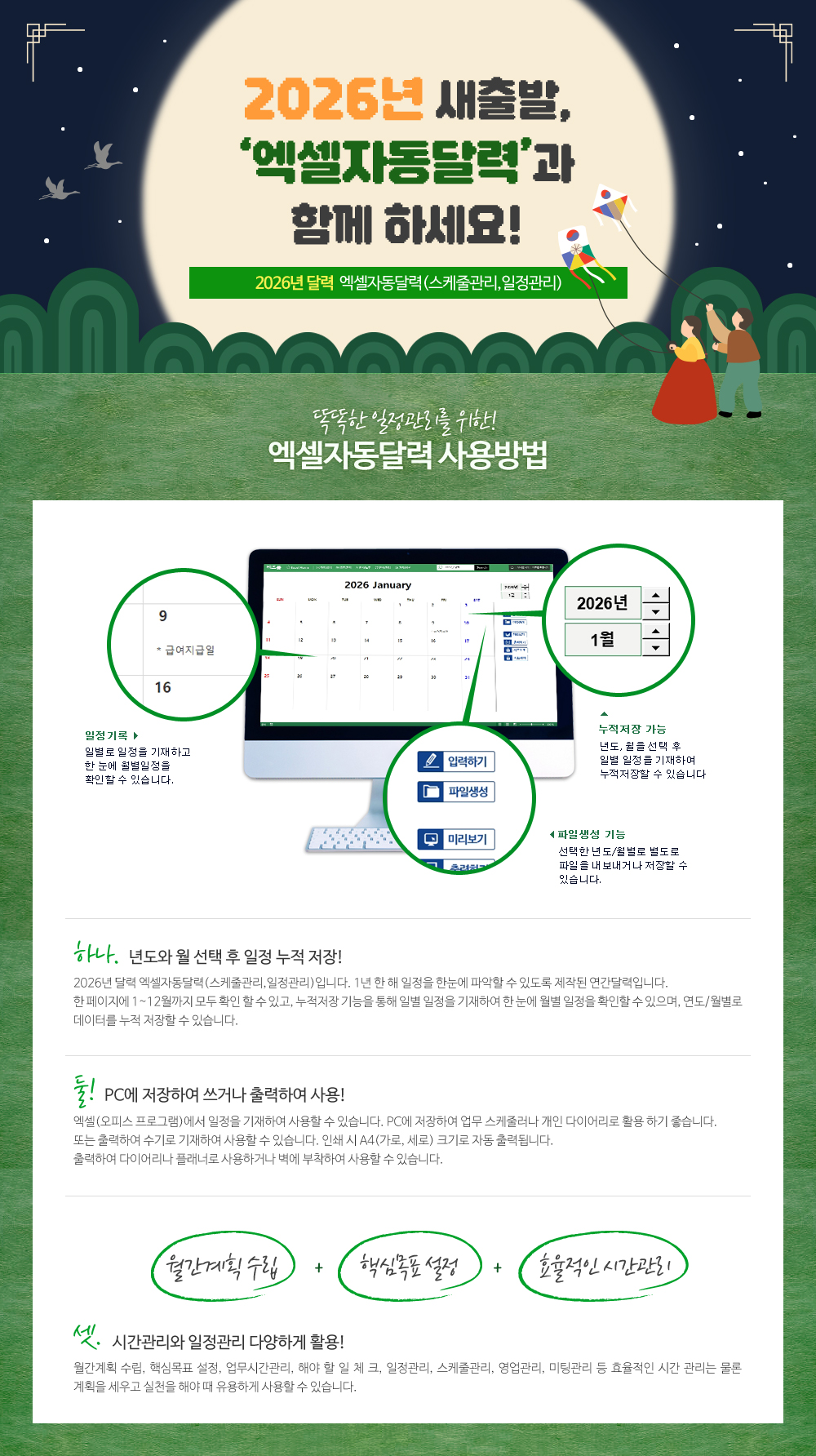 2026년 엑셀자동달력(스케줄관리,일정관리) 서식입니다. 2026년 엑셀 자동 달력 서식은 스케줄과 일정을 손쉽게 관리할 수 있도록 설계된 효율적인 도구로 자동으로 날짜와 요일이 업데이트 되어 번거로움 없이 바로 일정을 기록하고 한눈에 파악할 수 있습니다. 개인적인 일정 및 업무 일정을 입력한 후 [입력하기] 버튼을 클릭하면 일정을 저장할 수 있습니다.