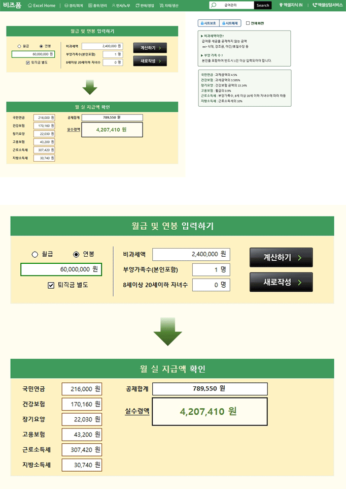 4대보험요율 반영 · 실수령액 즉시 확인