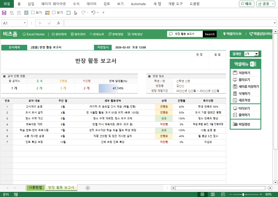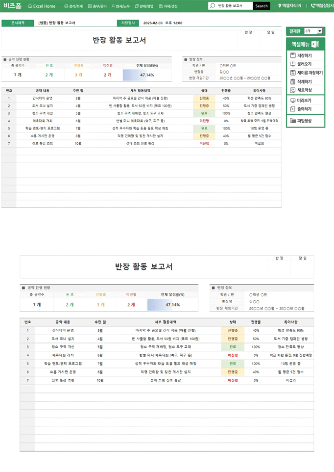 반장 활동 보고서 서식입니다. 반장으로서 수행한 주요 업무와 역할을 체계적으로 기록하는 문서로 반장이 선거 시 제시한 공약을 바탕으로 임기 동안 실천한 활동과 성과를 기록하여 결과와 개선 사항을 명확히 제시함으로써 신뢰성을 높일 수 있습니다. 작성 건별로 데이터 누적, 저장, 수정, 불러오기, 별도 파일로 저장이 가능한 엑셀 데이터 서식입니다.