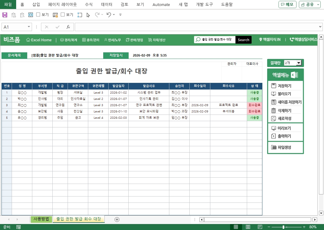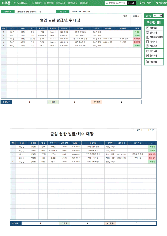 출입 권한 발급 회수 대장 서식입니다. 구성원이나 외부 방문자의 출입 권한을 체계적으로 관리하기 위한 문서로 권한 구역 및 권한 레벨, 발급 및 회수 일자, 인적사항, 상태 등을 정확히 기록하여 출입 통제를 강화하고 보안을 유지하는 역할을 수행합니다. 작성 건별로 데이터 누적, 저장, 수정, 불러오기, 별도 파일로 저장이 가능한 엑셀 데이터 서식입니다.