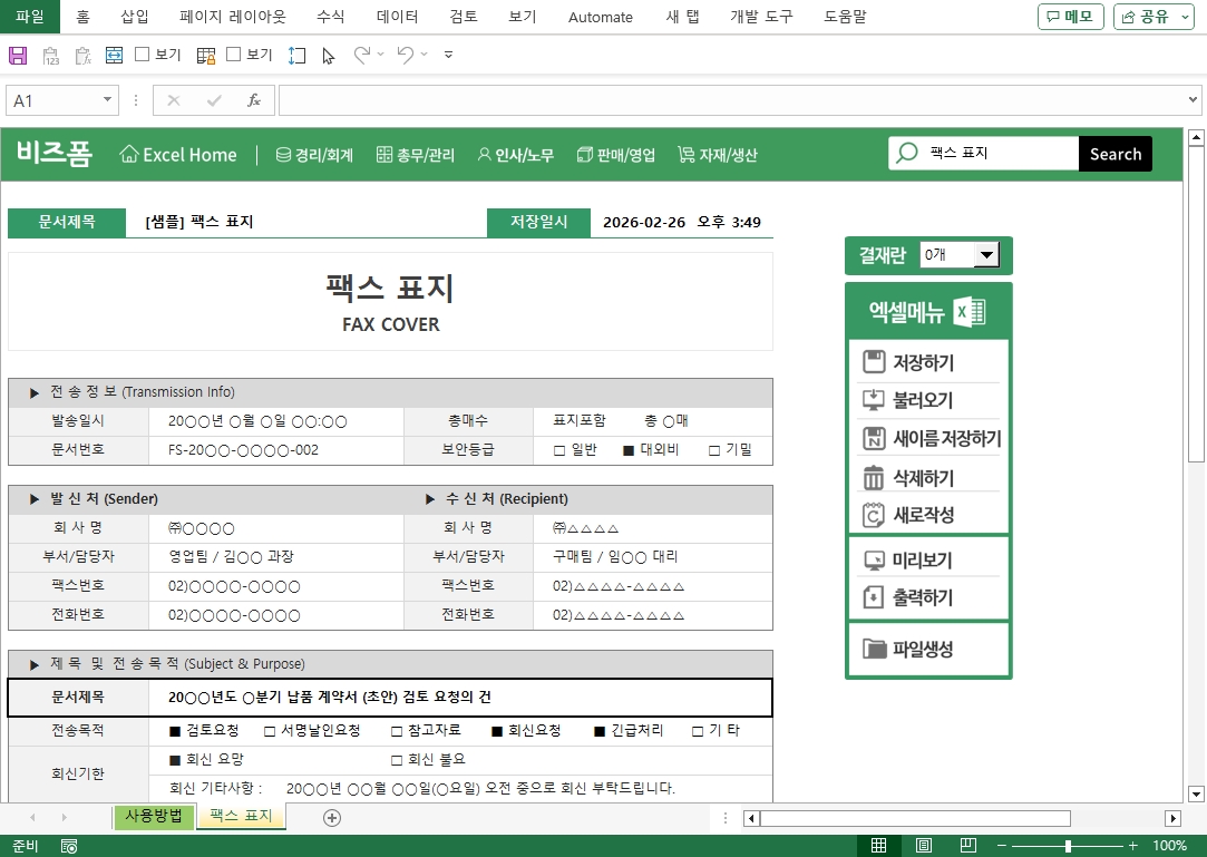 사용방법, 팩스 표지 |