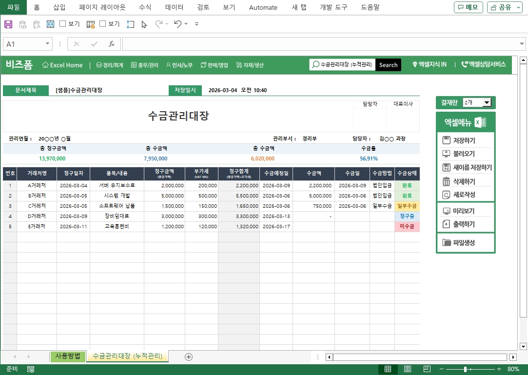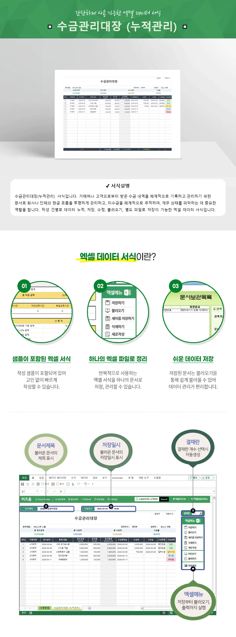 수금관리대장(누적관리) 서식입니다. 거래처나 고객으로부터 받은 수금 내역을 체계적으로 기록하고 관리하기 위한 문서로 회사나 단체의 현금 흐름을 투명하게 관리하고, 미수금을 체계적으로 추적하며, 재무 상태를 파악하는 데 중요한 역할을 합니다. 작성 건별로 데이터 누적, 저장, 수정, 불러오기, 별도 파일로 저장이 가능한 엑셀 데이터 서식입니다.