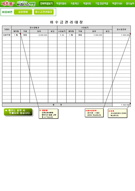 9,000원/월각 항목에 맞게 내역을 입력하고 해당월은 드롭다운 버튼을 이용하여 선택가능하며 미수금잔액이 자동으로 계산되는 미수금관리대장입니다.