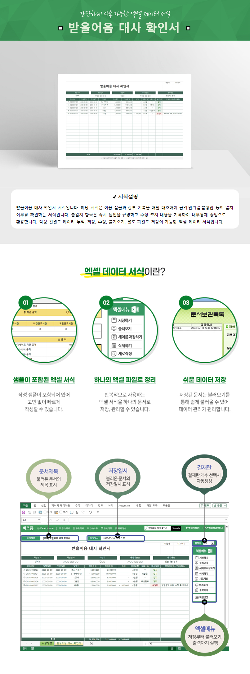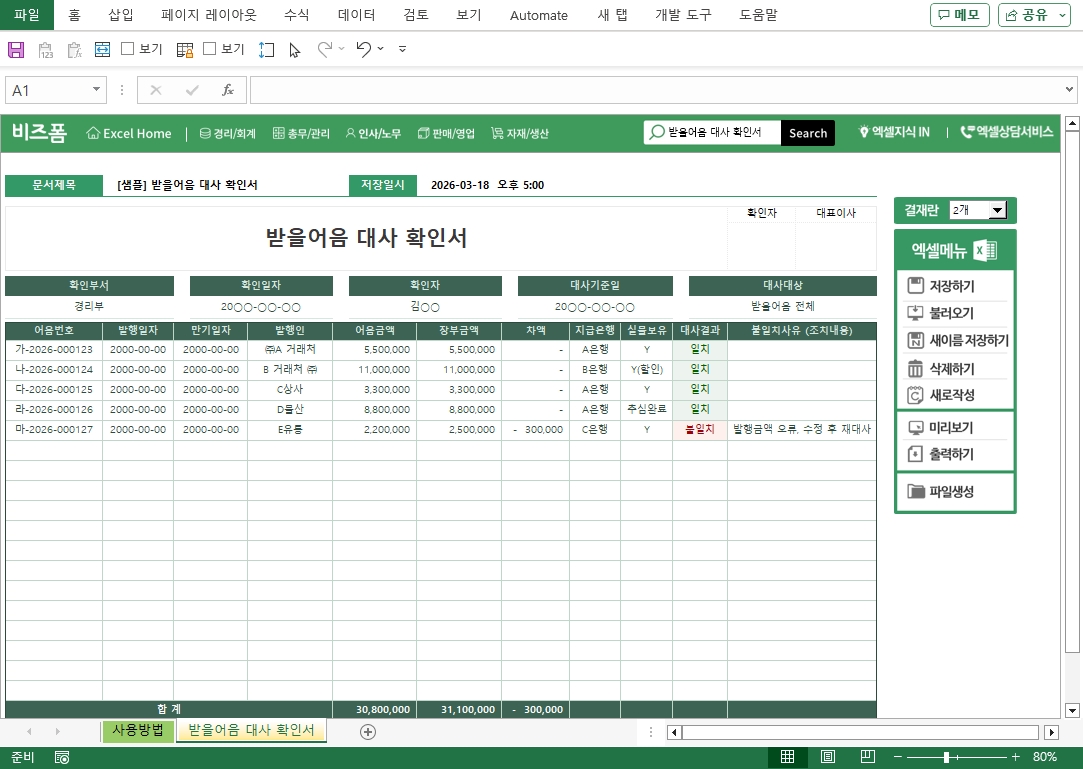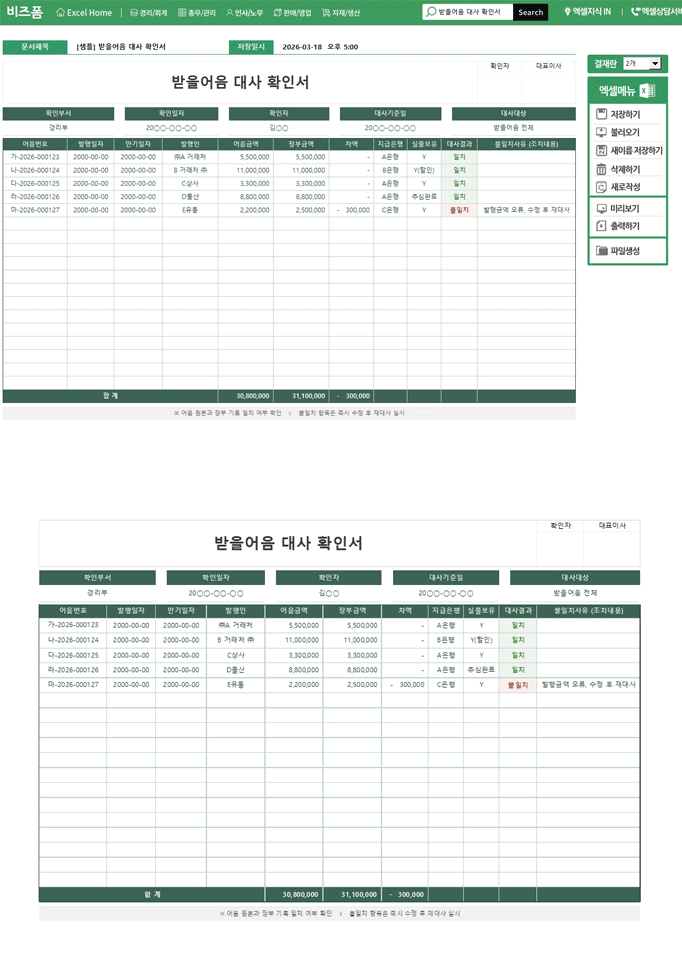 받을어음 대사 확인서 서식입니다. 해당 서식은 어음 실물과 장부 기록을 매월 대조하여 금액·만기일·발행인 등의 일치 여부를 확인하는 서식입니다. 불일치 항목은 즉시 원인을 규명하고 수정 조치 내용을 기록하여 내부통제 증빙으로 활용합니다. 작성 건별로 데이터 누적, 저장, 수정, 불러오기, 별도 파일로 저장이 가능한 엑셀 데이터 서식입니다.
