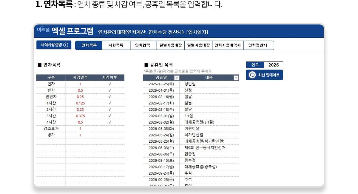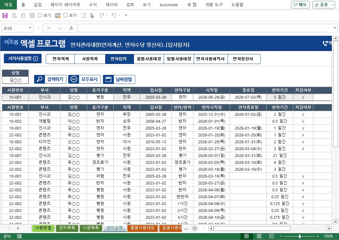 연차관리 프로그램 (입사일자 기준, 연차입력, 연차사용내역서, 연차수당 정산서) 서식입니다. 연차관리 프로그램은 입사일자를 기준으로 연차 발생 일수를 자동 계산하여 근로자별 연차를 체계적으로 관리할 수 있도록 설계된 엑셀 프로그램입니다. 근로자가 사용한 연차 내역을 기록하는 연차 입력 기능은 물론, 연차정산서(연차수당) 시트를 통해 미사용 연차에 대한 금전적 보상액을 자동으로 산출함으로써 연차수당 지급 업무를 보다 효율적으로 처리할 수 있습니다. 또한 연차, 반차, 반반차, 조퇴(1시간 단위)를 하나의 프로그램에서 통합 관리할 수 있으며, 공휴일 목록(주말, 법정 공휴일, 창립기념일 등)을 통해 연차 사용 기간 내 휴일이 자동으로 제외되어 실제 연차 일수가 정확하게 산정 됩니다.