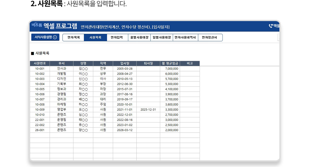 ① 사원목록 : 사원번호, 부서, 성명, 직책, 입사일, 퇴사일, 월 평균임금, 비고를 입력합니다. |