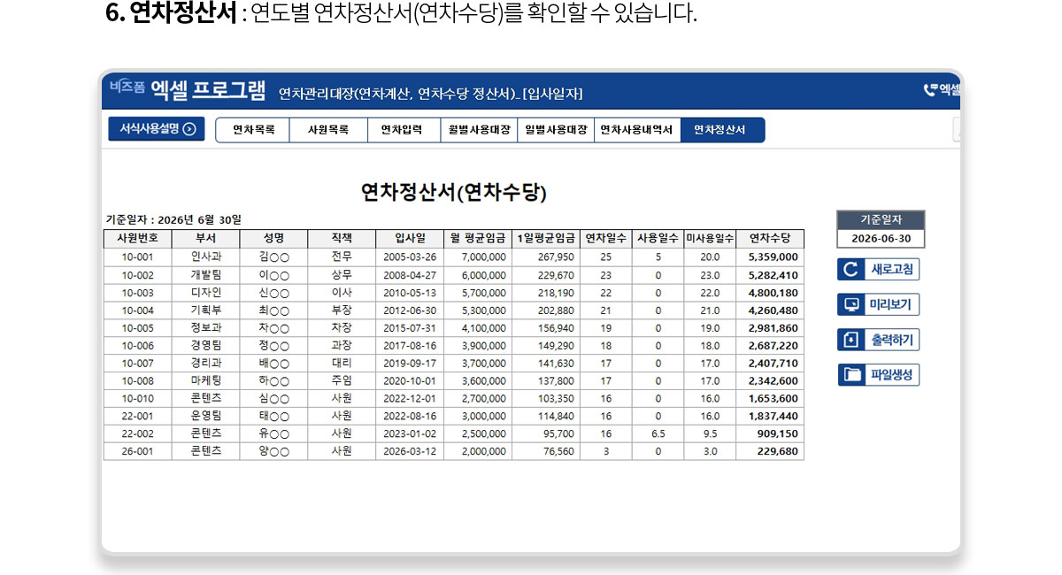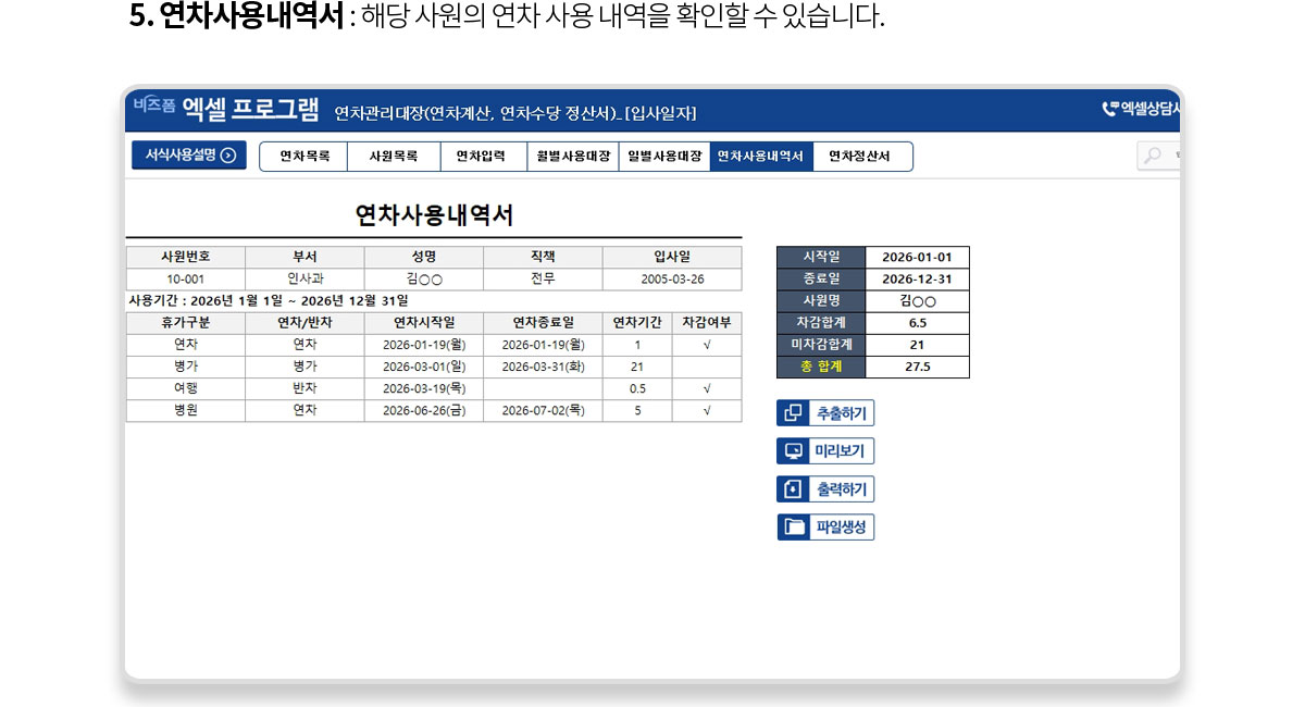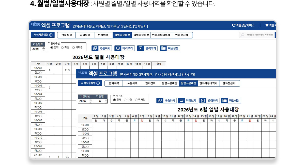 사용설명, 연차목록, 사원목록, 연차입력, 월별사용대장, 일별사용대장, 연차사용내역서, 연차정산서(연차수당) |