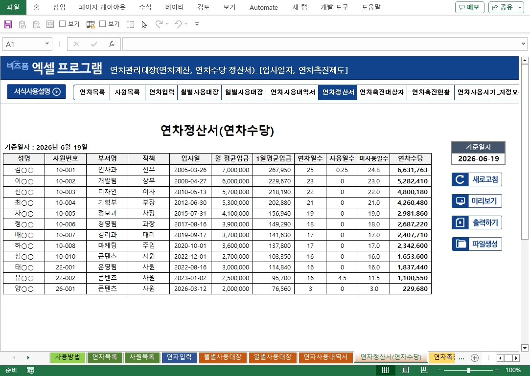 연차관리 프로그램 (입사일자 기준, 연차촉진제도, 연차사용내역서, 연차정산서, 연차수당) 서식입니다. 입사일자를 기준으로 연차 발생 일수를 자동 계산하여 근로자별 연차를 체계적으로 관리할 수 있도록 설계된 엑셀 프로그램입니다. 근로자가 사용한 연차 내역을 기록하는 연차 입력 기능은 물론, 연차정산서(연차수당) 시트를 통해 미사용 연차에 대한 금전적 보상액을 자동으로 산출함으로써 연차수당 지급 업무를 보다 효율적으로 처리할 수 있습니다. 또한 연차, 반차, 반반차, 조퇴(1시간 단위)를 하나의 프로그램에서 통합 관리할 수 있으며, 공휴일 목록(주말, 법정 공휴일, 창립기념일 등)을 등록해 두면 연차 사용 기간 내 공휴일이 자동으로 제외되어 실제 연차 일수가 정확하게 산정됩니다. 아울러 근로기준법에서 정한 연차촉진제도 서식을 함께 제공하여, 사용자가 근로자에게 연차 사용을 독려하는 절차를 법적 요건에 맞게 진행할 수 있도록 지원합니다. 연차촉진 통보 및 근로자의 사용 시기 지정 내역을 체계적으로 기록·관리함으로써 미사용 연차에 대한 수당 지급 의무를 면제받기 위한 요건을 갖추는 데 도움을 드립니다.