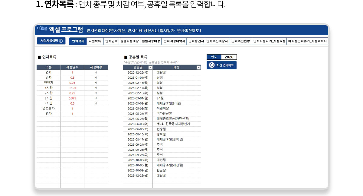 ② 공휴일 목록 : 연도를 입력한 후 [최신 업데이트]버튼을 클릭하면 해당 연도의 공휴일이 자동 업데이트 됩니다.
