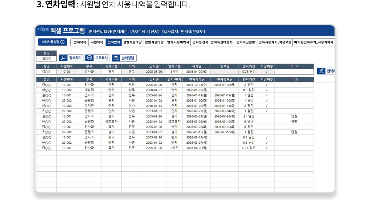 | ① 입력하기 : 성명, 휴가 구분, 연차구분, 연차시작일, 연차종료일을 입력한 후 [입력하기]를 클릭하면 리스트에 내역이 등록됩니다.
