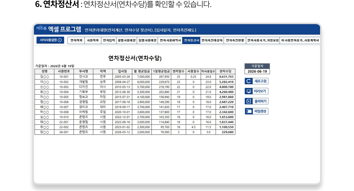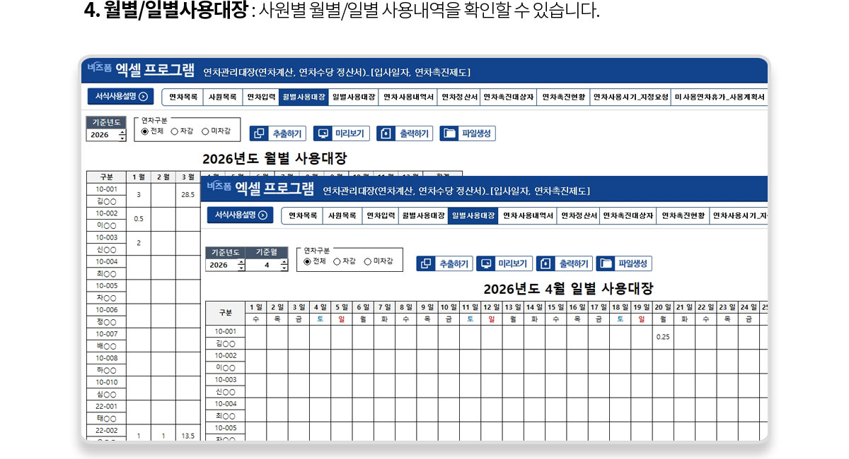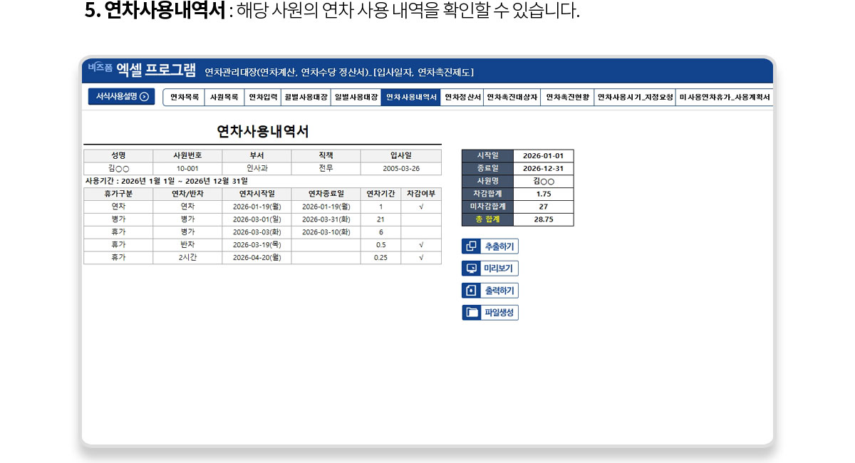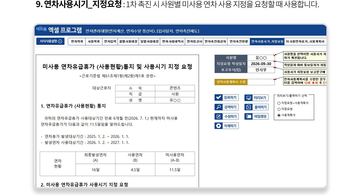 사용설명, 연차목록, 사원목록, 연차입력, 월별사용대장, 일별사용대장, 연차사용내역서, 연차정산서, 연차촉진대상자, 연차촉진현황, 연차사용시기 지정요청, 미사용연차휴가 사용계획서, 연차사용시기 지정통보 |
