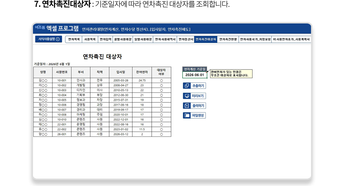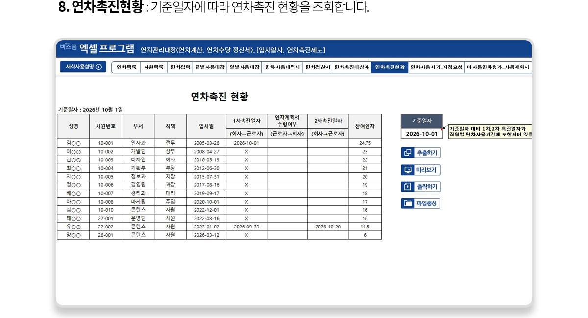 | ① 추출하기 : 기준일자에 따라 연차촉진 현황을 조회합니다.