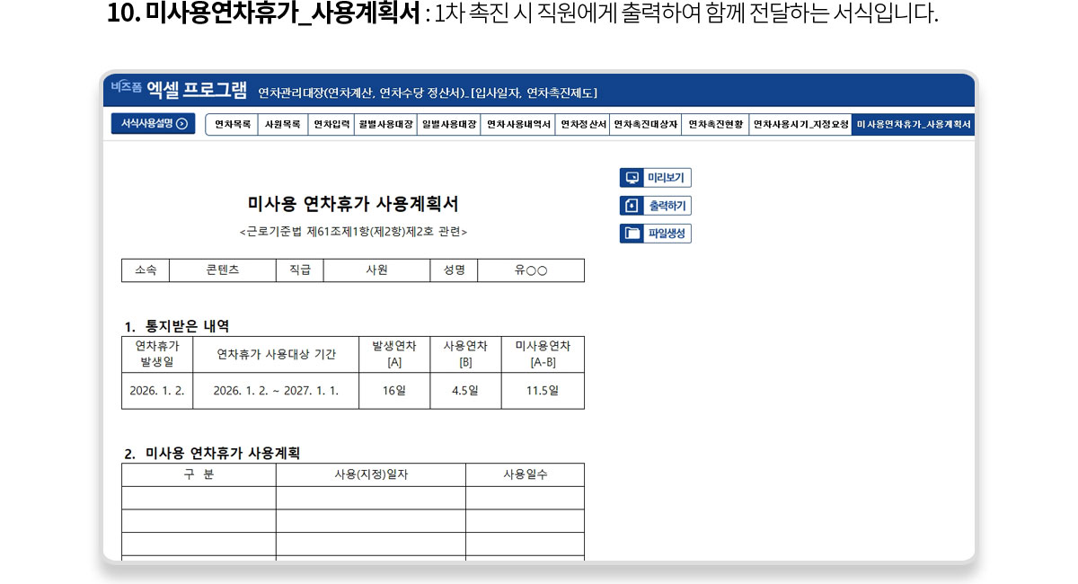 해당 시트는 1차 촉진 시 연차사용 촉진 대상 직원에게 출력하여 전달하는 용도로 사용됩니다. |