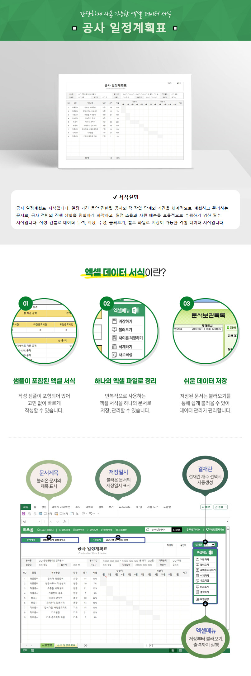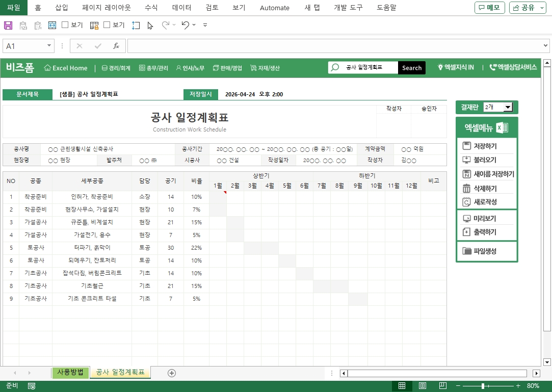 공사 일정계획표는 공사 착공부터 준공까지 각 공종별 작업 순서, 기간을 시간 축에 배치하여 공사 전체 흐름을 시각적으로 관리하는 공사 관리 문서입니다. 공사 관계자 전원이 동일한 일정 기준을 공유하고 공정 간 선후 관계, 병행 작업 구간, 핵심 경로(Critical Path)를 파악하여 공기 지연을 예방하는 데 핵심적인 역할을 합니다.