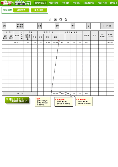 9,000원/월비품의 적요를 입력하고 증감사항의 수량과 단가를 입력하면 금액이 계산되고 사용처별 수량의 합계가 자동으로 계산되는 비품대장입니다.