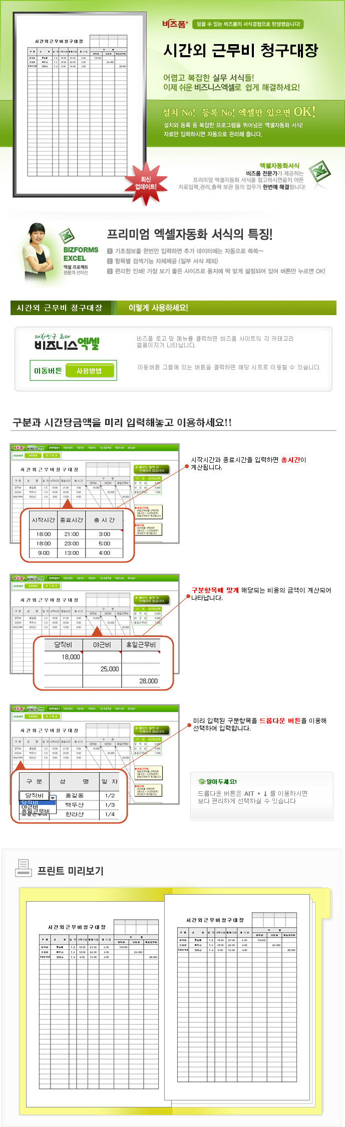 9,000원/월시간외 근무비로 청구되는 비용항목과 금액을 입력하면 근무시간에 따른 금액이 자동으로 계산됩니다.