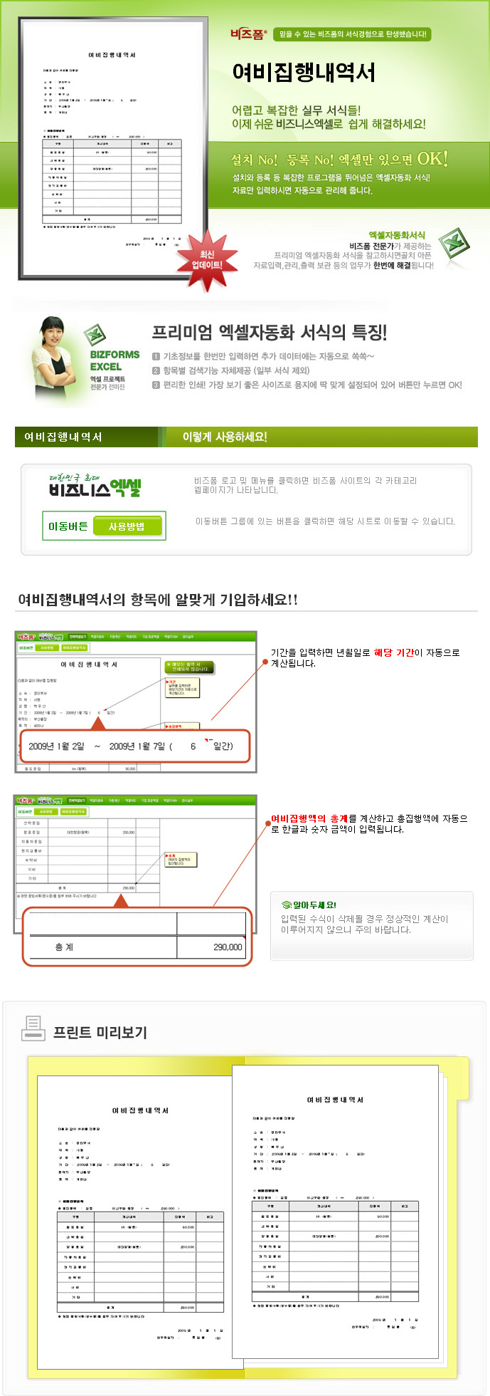 9,000원/월여비집행내역서와 여비지급명세로 구분되어 있으며 집행액에 대한 총금액이 자동으로 계산됩니다.