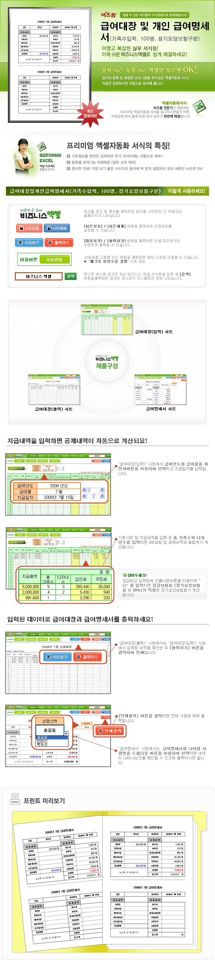 9,000원/월급여내역을 입력하면 지급액을 기준으로 4대보험 및 갑근세, 주민세 등이 자동으로 계산되어 급여대장 및 급여명세서를 출력할 수 있도록 도와주는 자동화서식입니다. (장기요양보험료/건강보험 항목구분)