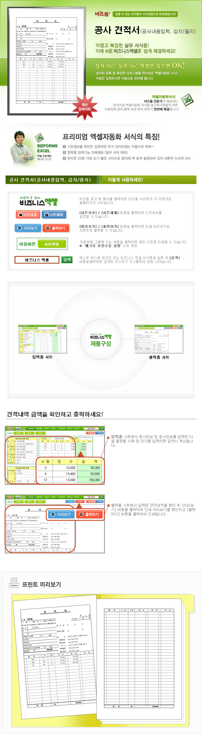 9,000원/월공사의 기본사항과 견적단가와 수량 품목을 입력하면 공사 견적서가 출력폼 견적서 서식에 자동으로 이동되어 갑지/을지 양식으로 출력할 수 있는 자동화 서식입니다.