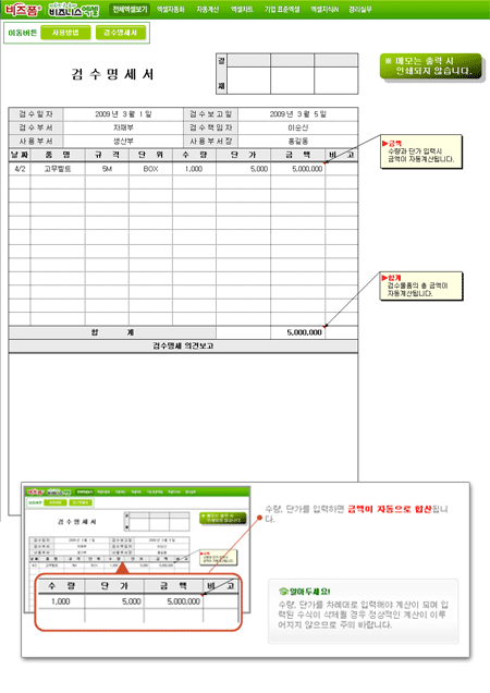 9,000원/월검수 물품의 수량과 단가를 입력하면 금액과 총 합계가 자동계산되는 서식입니다.