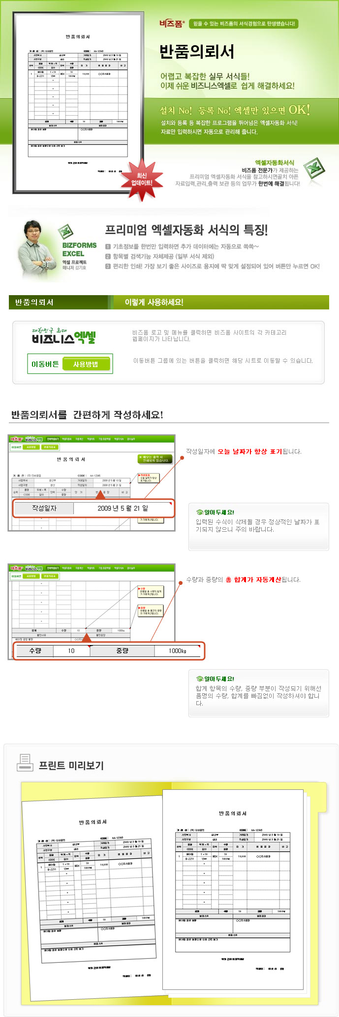 9,000원/월반품 제품의 수량과 중량의 총 합계가 자동계산되는 서식입니다.