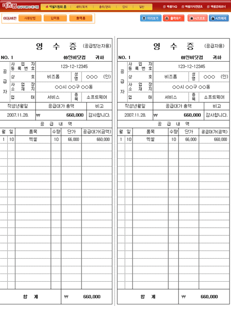 9,000원/월기본적인 영수증의 양식으로 입력폼에 공급자와 공급받는자 품목명, 수량, 단가를 입력하면 출력폼에서 영수증의 양식으로 출력할 수 있는 자동화 서식입니다.