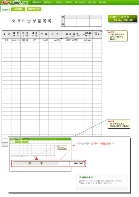 9,000원/월납품수량, 납품단가를 입력하면 납품금액이 자동으로 계산되고 총 금액이 계산되는 자동계산 서식입니다.
