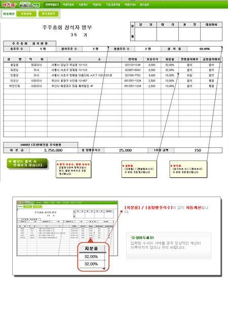 9,000원/월주주총회 참석, 불참, 출석률, 참석하는 주주들의 주주 지분현황이 자동계산되는 서식입니다.