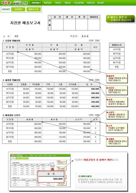 9,000원/월각 지점의 매출을 분석하여 비교하여 보고할때 사용하는 서식입니다. 제품군들의 합계, 순이익, 순위가 자동계산됩니다.