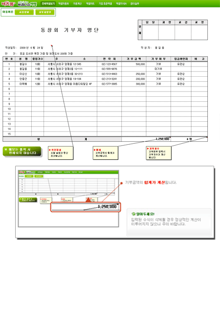9,000원/월동창회 기금 기부여부를 체크하면 기부한 인원수, 기부한 총 금액이 자동계산되는 서식입니다.